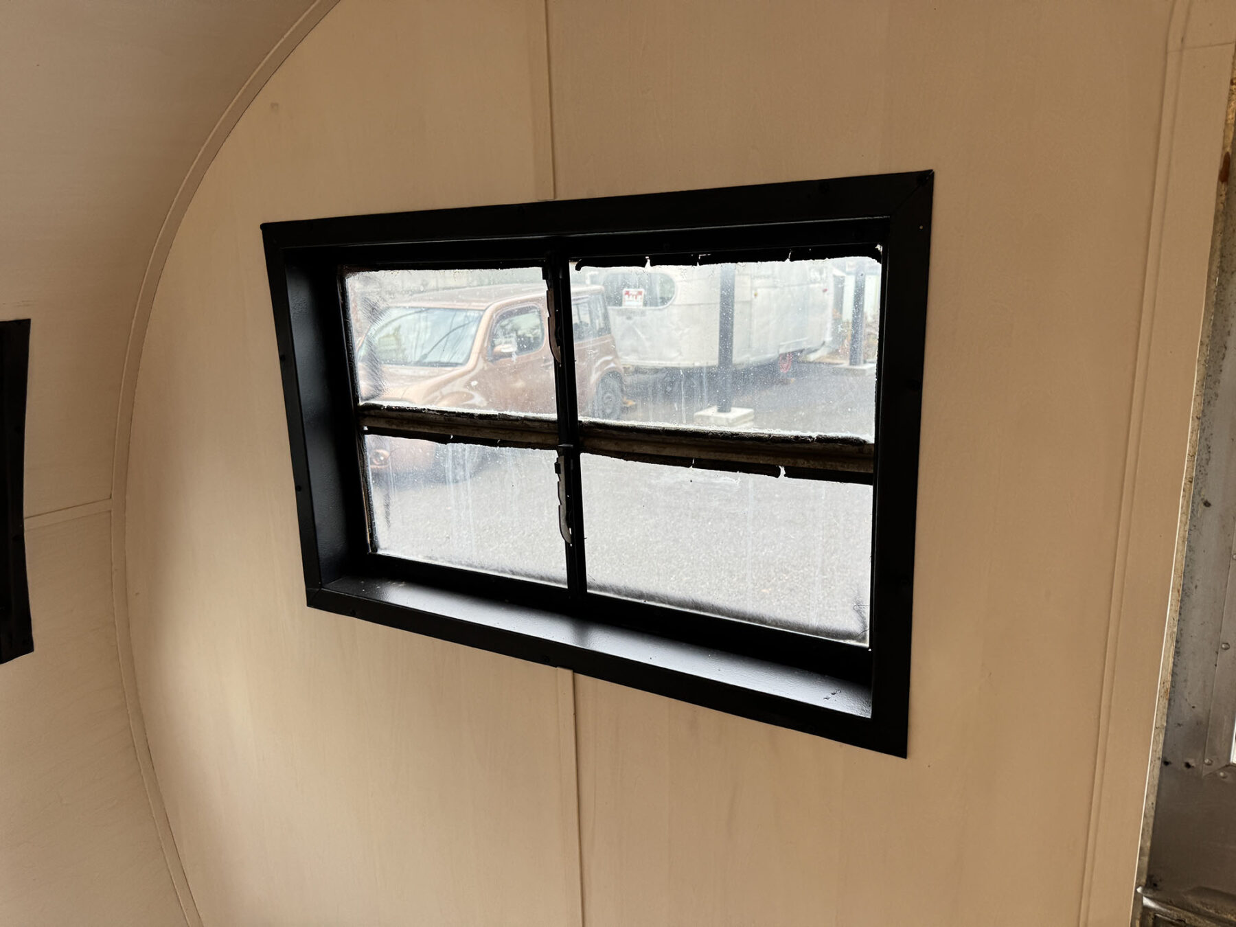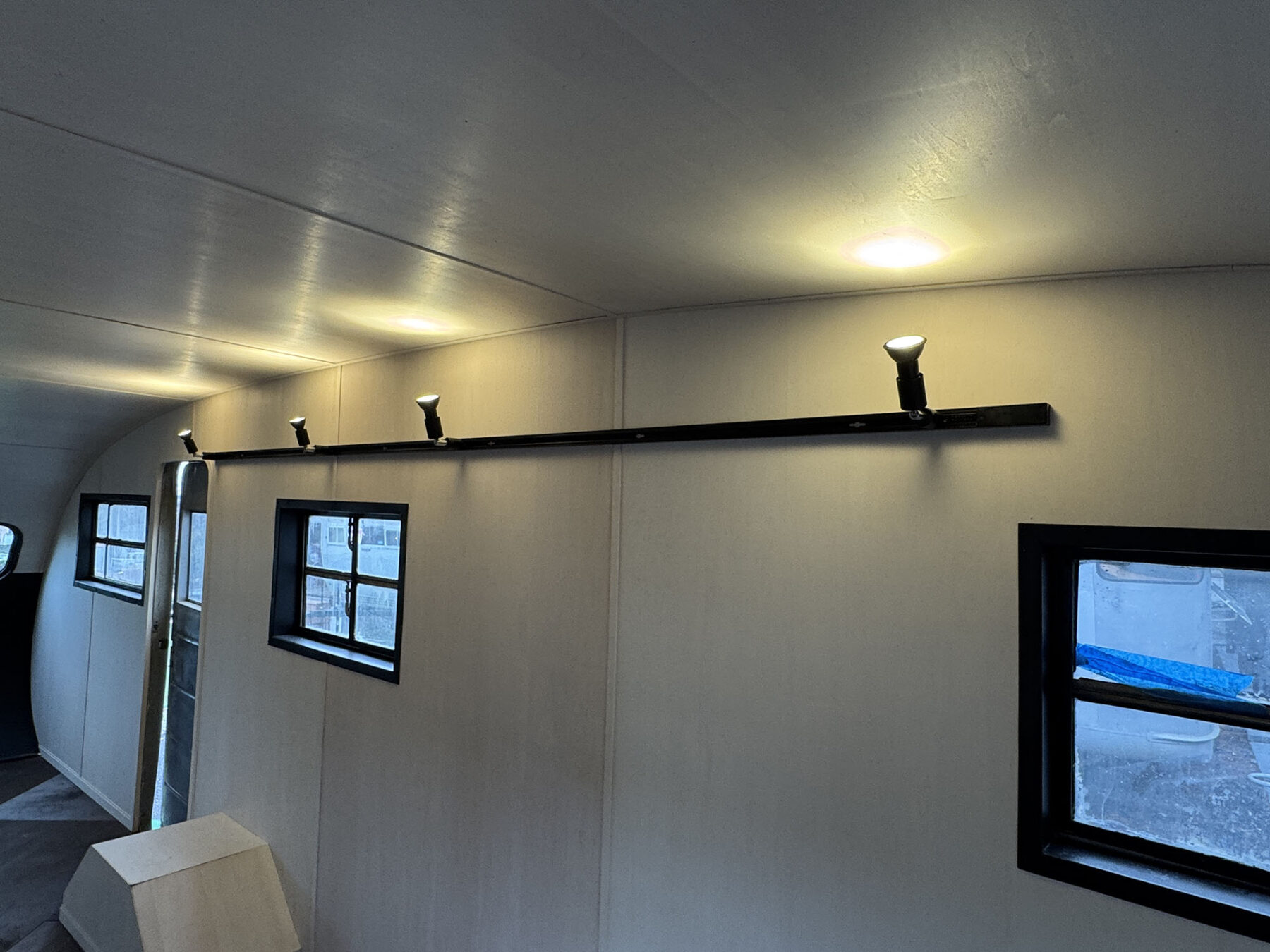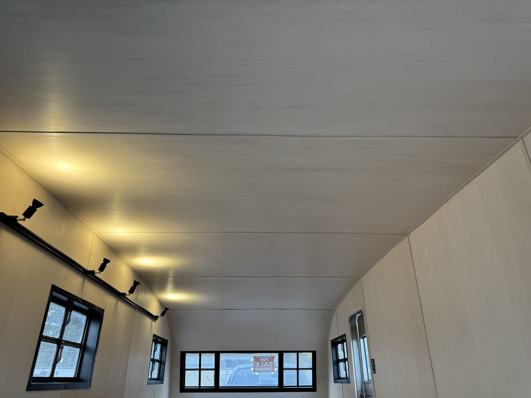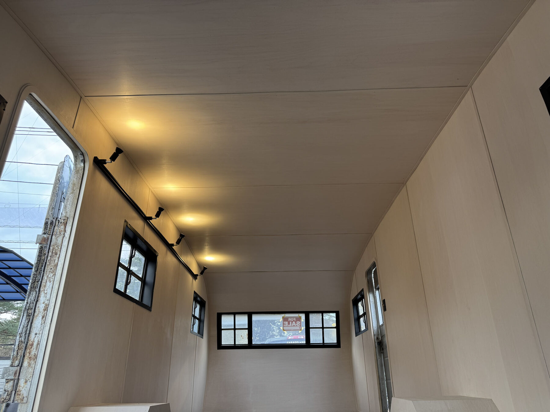 希少なショートサイズのスパルタネットです。日本到着後、きれいにスケルトン化し、断熱材の新設を行い、天井と壁をシナベニヤにて仕上げてあります。