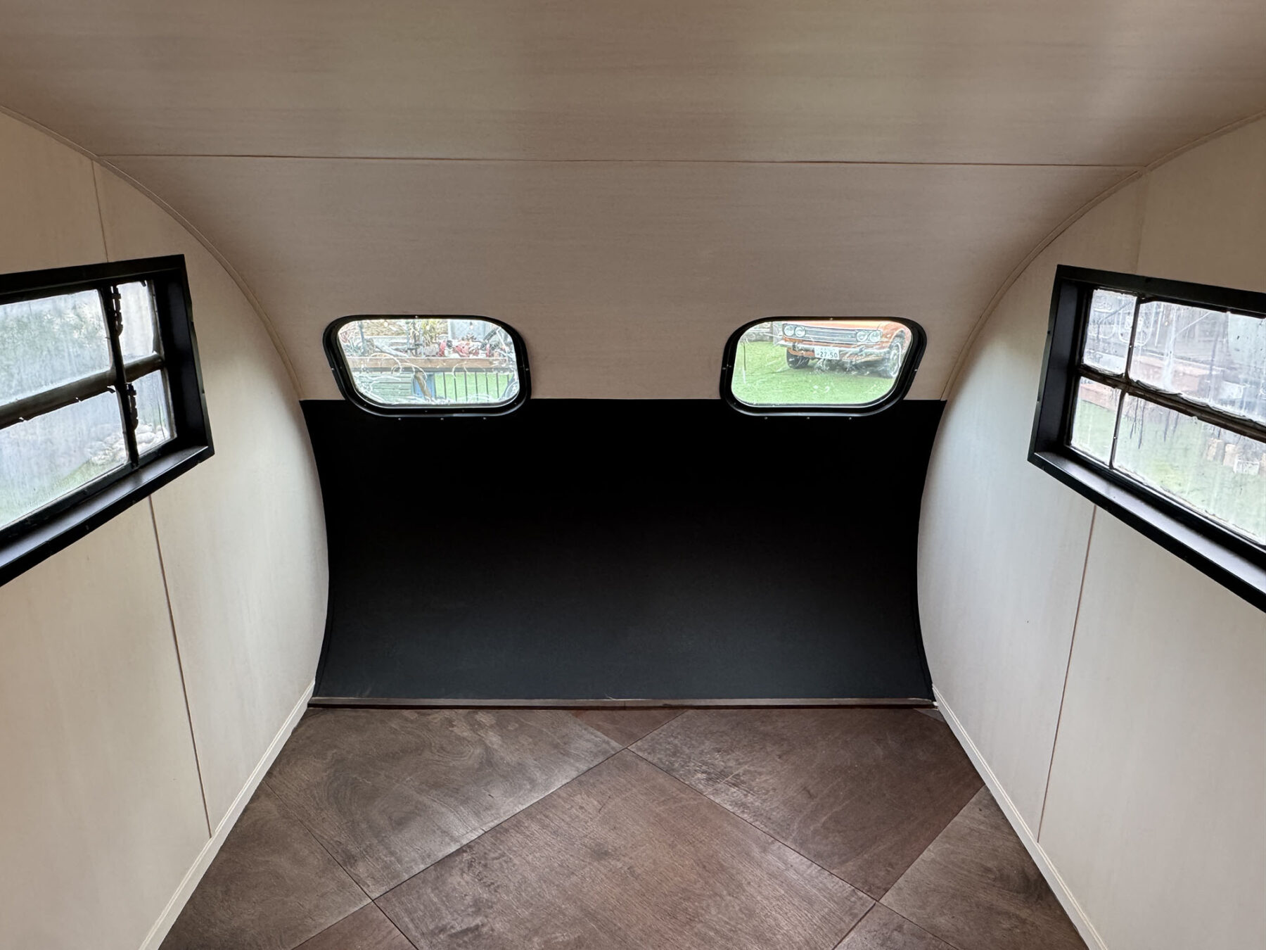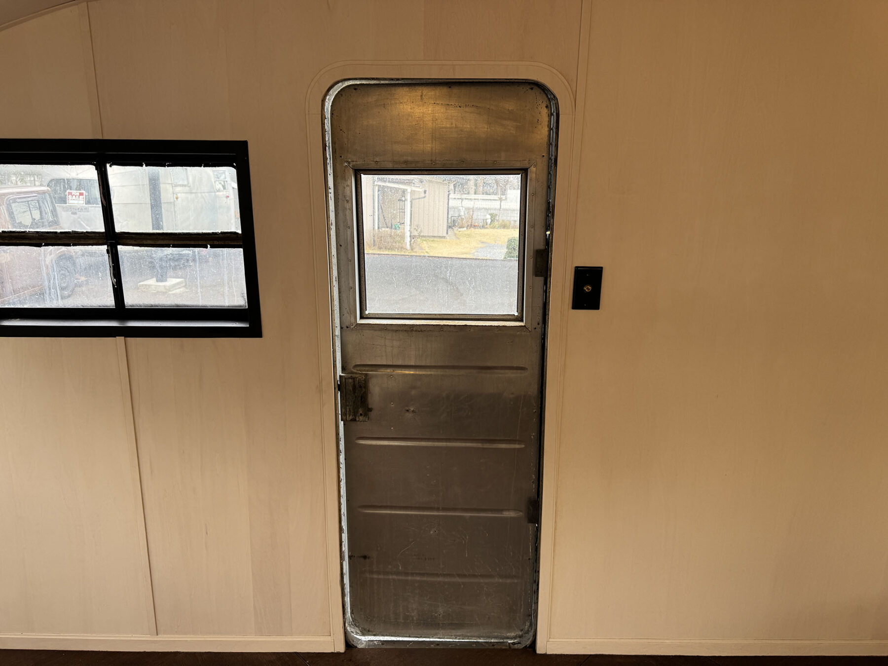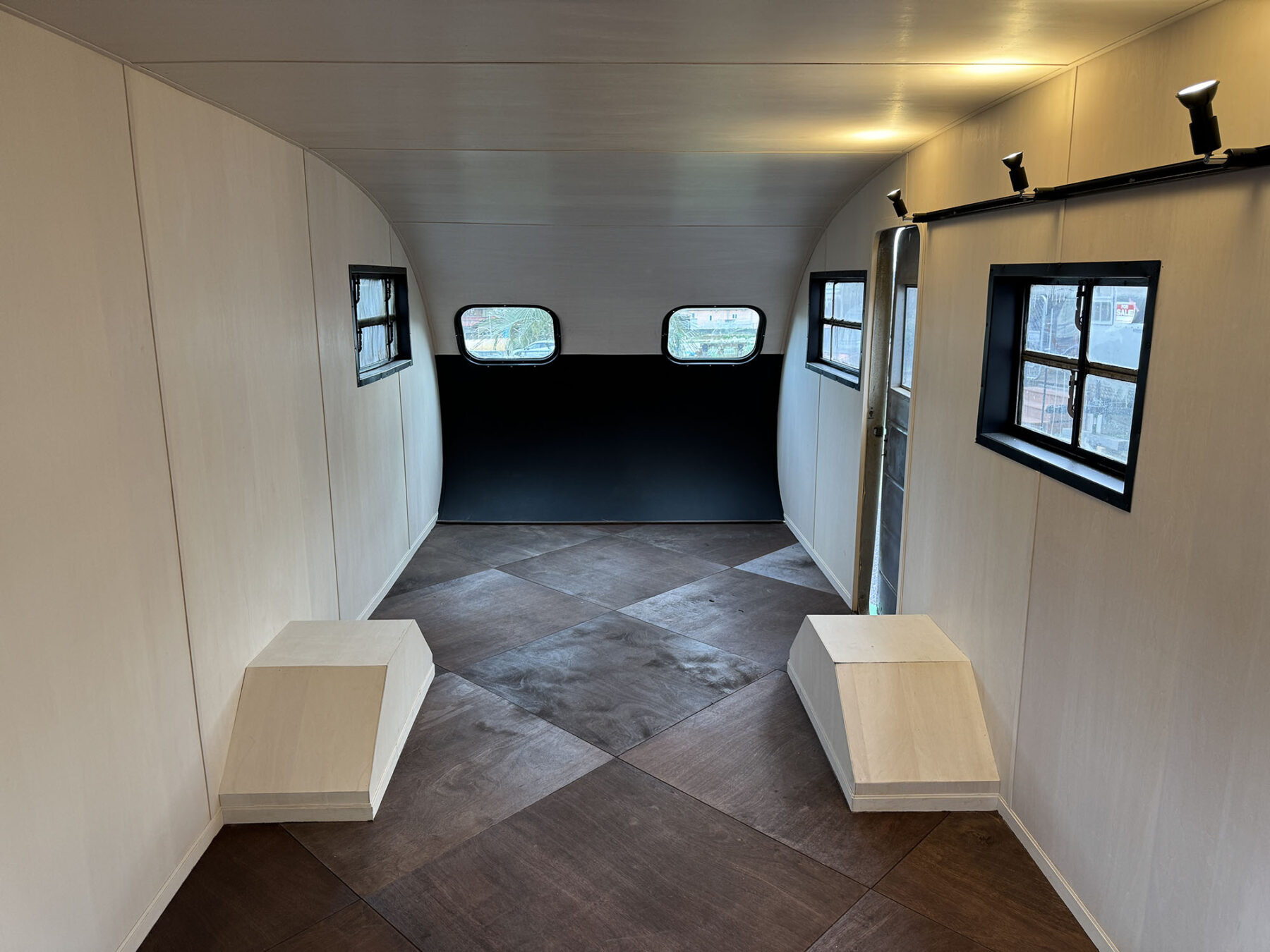 希少なショートサイズのスパルタネットです。日本到着後、きれいにスケルトン化し、断熱材の新設を行い、天井と壁をシナベニヤにて仕上げてあります。
