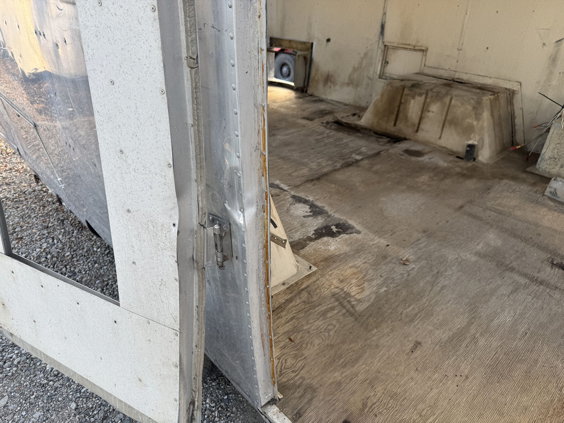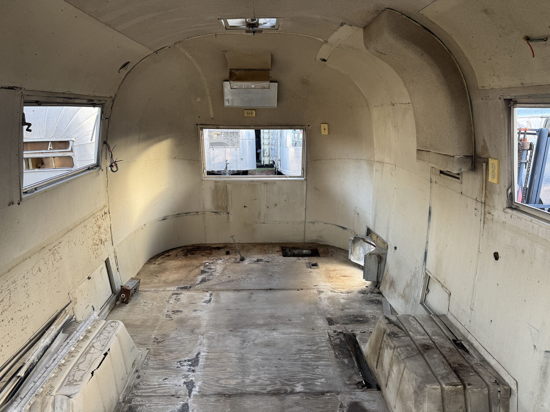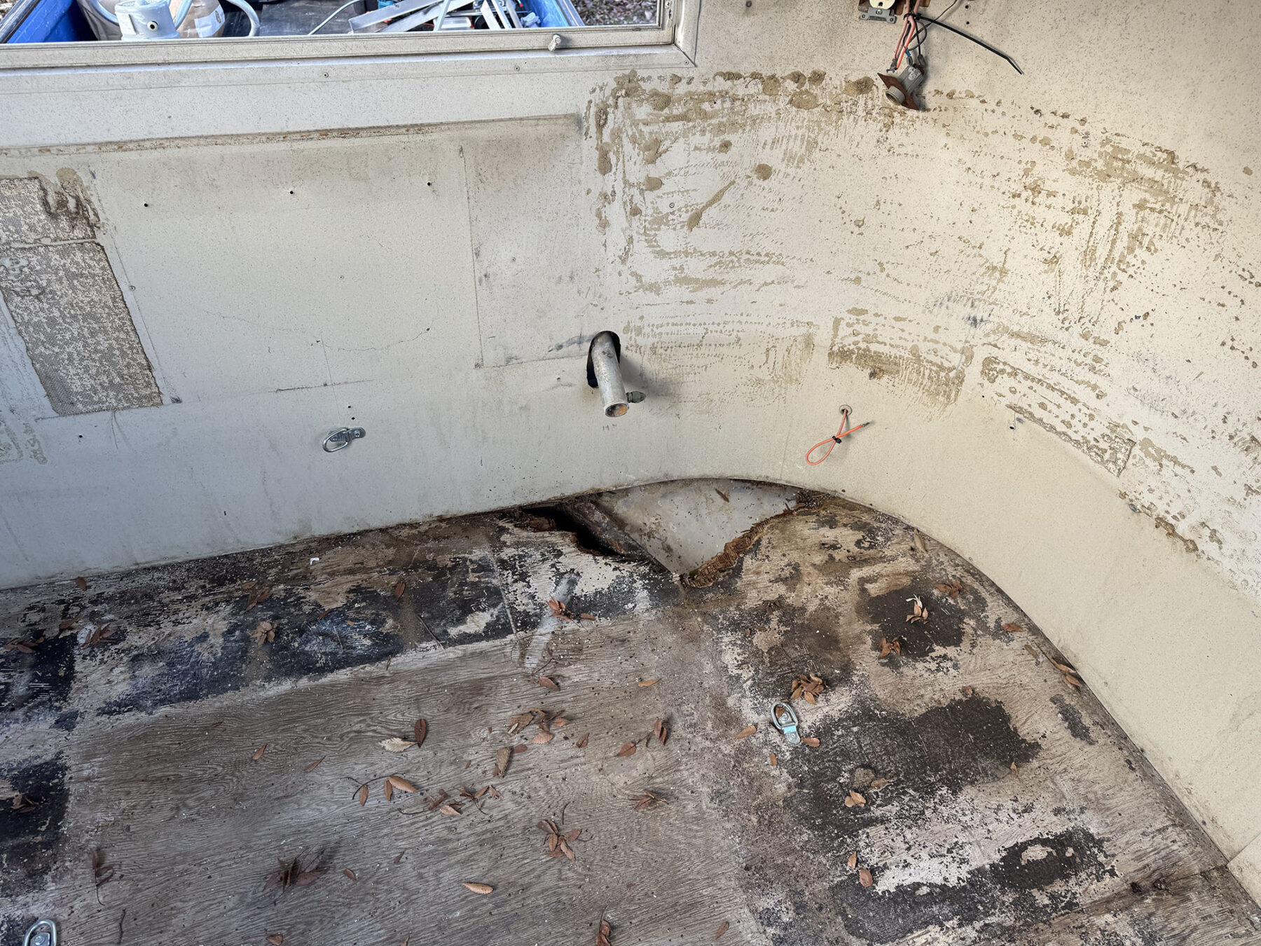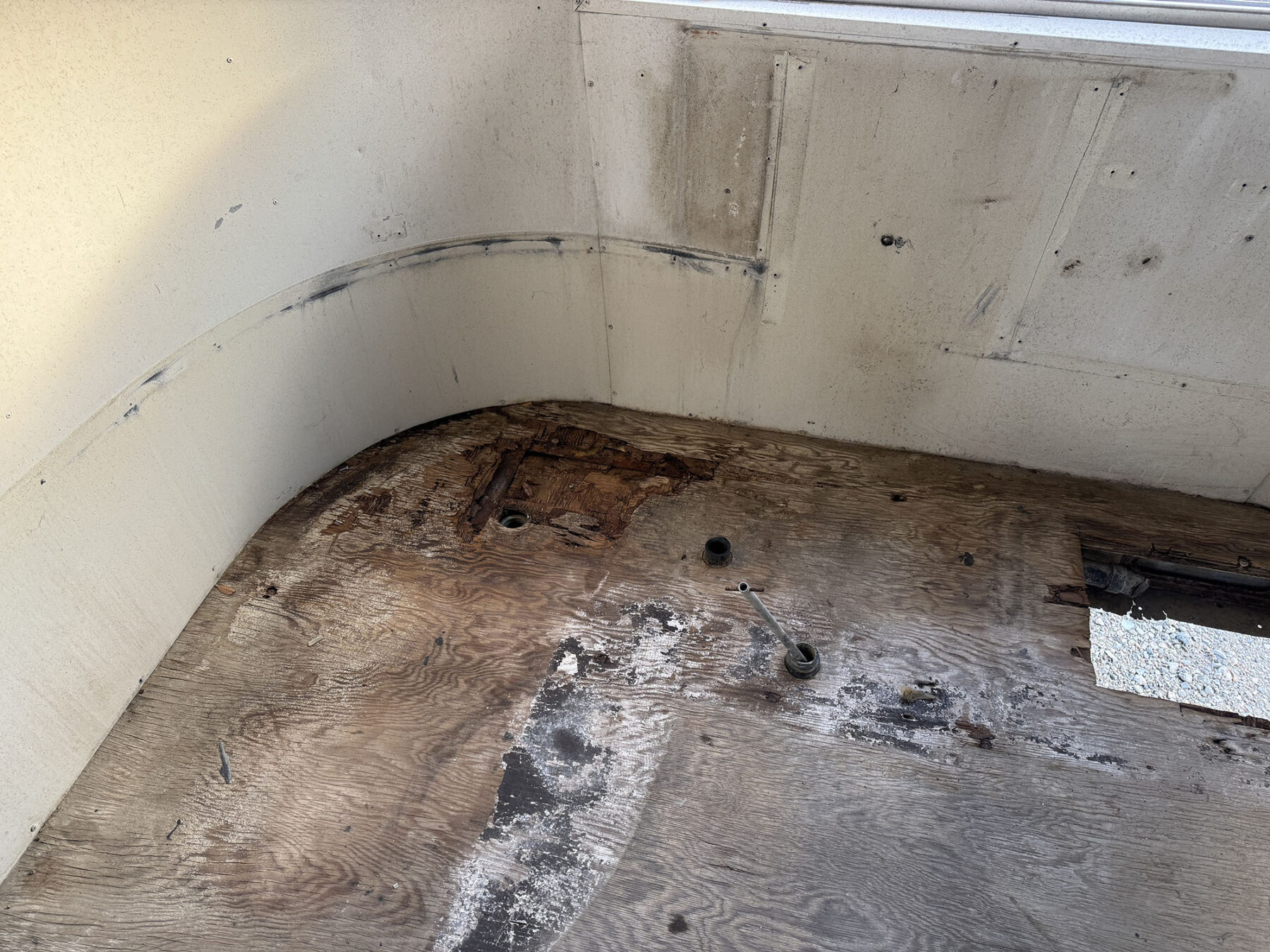 内装はスケルトン状態で、サブフロアの状態はそこそこ良いですが、画像の通り、フロント右側の上水タンク部分とリア右側のバスタブ周りのサブフロアはダメになっておりますが、水回り部分は致し方ない部分もございます。